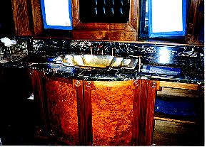 | Black and Gold marble with brass inlay on edge detailing. It includes a handmade Brown Onyx sink, accented with 18 carat gold fixtures. |
