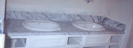 | Classic statuary vain Carrera double vanity with top mount porcelain sinks. The edge detail is 1.5 inch Dupont laminated. |
