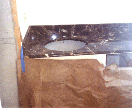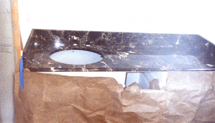 | Salt and Pepper granite single vanity with 5 inch back splash. The 7 inch mitred front skirt detail creates the illusion of a solid block. |