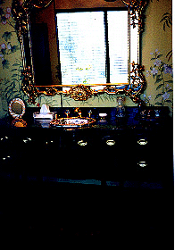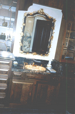 | Verde antique marble top with compound edging and surpentine features with scupped edging. Hand painted Wagner sink. |