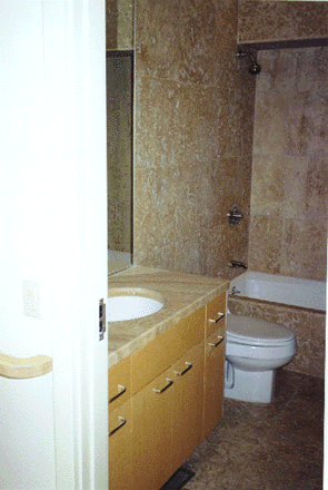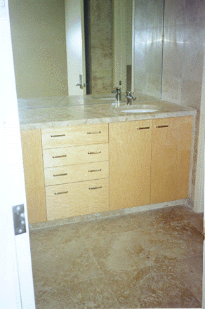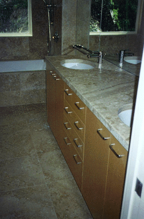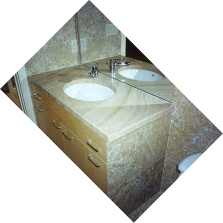 | Breccia Onciatta vanity top with 1.5 inch mitred edge. The floor is St Verans limestone 16x16 tiles. |