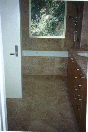 | Beaumanieres Light limestone vanity top made of 2 inch thick slab. The tub deck, floor and walls are St Verans limestone. |
