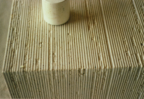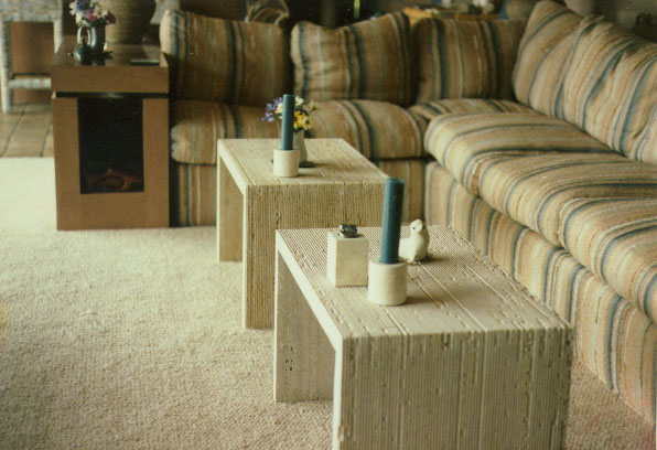 | Custom hand made dynasty Travertene coffee tables. The finish is fluted. All edges are mitred to appear it was carved from one solid block. |