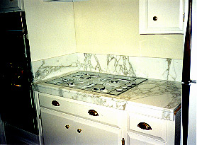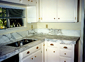 | Honed Carrera kitchen with matched back splashes. Beautiful and simple. |