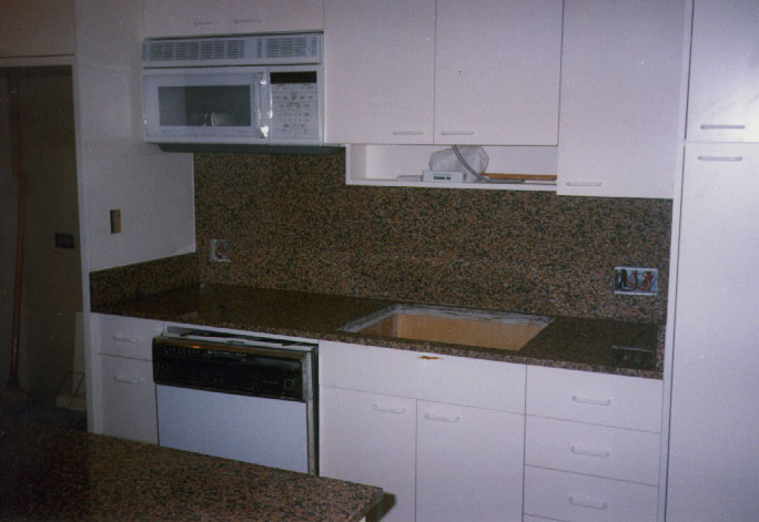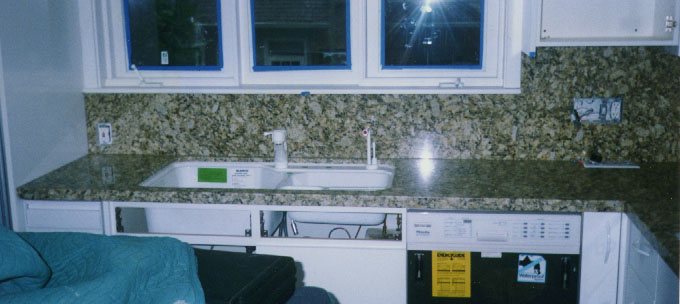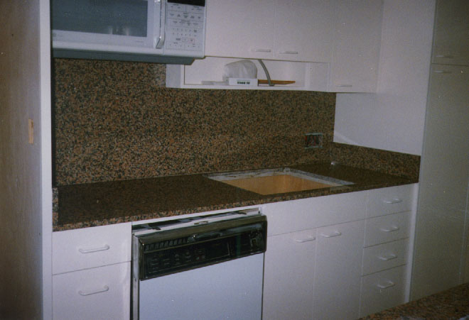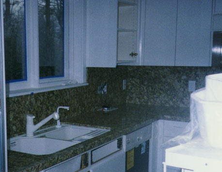 | 1.5 inch Juparana Light with mitred edge to create the illusion of thick granite. Full back splashes. Bottom mount sink. |