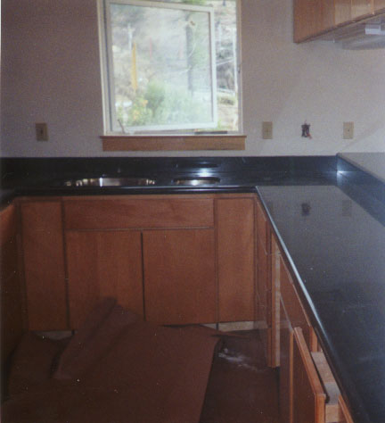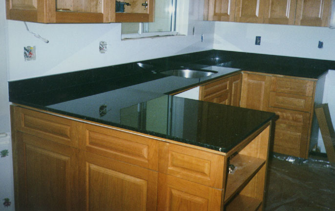 | Absolute Black granite, double bottom mount sink. 4 inch back splash including pass through to the right. 1.5 inch full bullnose. |