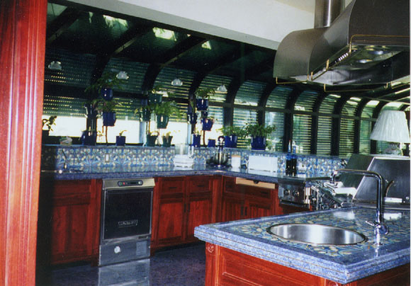 | Spectacular Brazilian Blue granite kitchen with 2.5 inch ogee brass inlay edge. Surrounded with hand painted French 6x6 tiles, with a cover on interior to match with level of finish of tiles. The floor is 12x12 matching Brazilian Blue granite. |