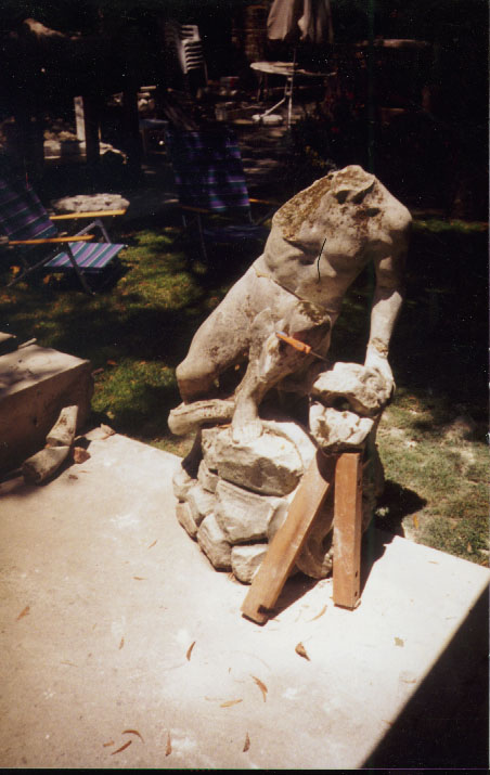 | The torso has now been reattached with steel rods hidden inside for strength. The knee has been applied with cam set and is clamped while hardening. |
